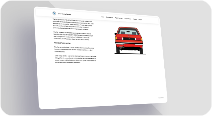 An Eye-Catching Tail End The first generation of the BMW 3 Series was famous for its distinctive profile with its raised tail section and the crease line along the body. Seen from behind, the rear section wasn’t to everyone’s taste, especially the part between the tail lights. Only a few months after the start of production, the designers added a black plastic trim to the rear. The first models in the BMW 3 Series range were a sedan – and the legendary Baur Topcabriolet (1977-1982). Stuttgart-based Baur GmbH was in charge of the transformation of 4,595 BMW 3 Series into convertibles, which featured a rollover bar and fixed roof frame. A Standard Feature was Born The first-generation BMW 3 Series included one innovation that was to become a standard feature in all BMW models: a dashboard angled toward the driver. Other design details – such as the short overhang at the front, the double- kidney grille, the crease line along the body, the twin headlamps found on several models, and the Hofmeister kink at the C-pillar – have lived on as stylistic features in subsequent generations. Next article Sheer Driving Pleasure Home Circular World Digital Journey Electric Future Freude Models