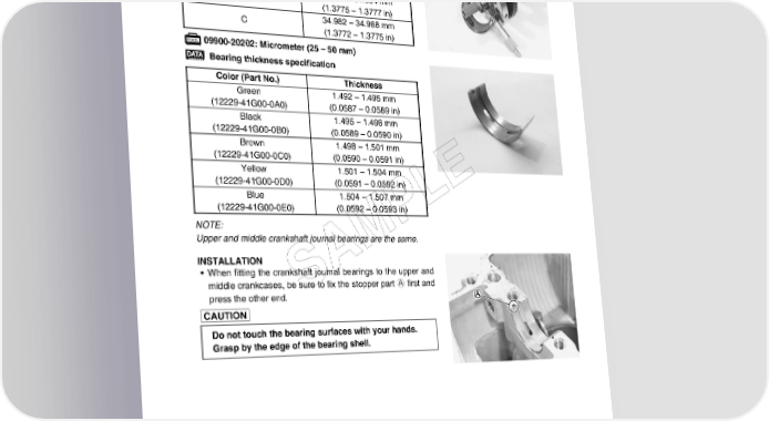 ENGINE 3-71 Crankshaft journal O.D. specification Code O.D. specification A 34.994 – 35.000 mm (1.3777 – 1.3780 in) B 34.988 – 34.994 mm (1.3775 – 1.3777 in) C 34.982 – 34.988 mm (1.3772 – 1.3775 in) 09900-20202: Micrometer (25 – 50 mm) Bearing thickness specification Color (Part No.) Thickness Green 1.492 – 1.495 mm (12229-41G00-0A0) (0.0587 – 0.0589 in) Black 1.495 – 1.498 mm (12229-41G00-0B0) (0.0589 – 0.0590 in) Brown 1.498 – 1.501 mm (12229-41G00-0C0) (0.0590 – 0.0591 in) Yellow 1.501 – 1.504 mm (12229-41G00-0D0) (0.0591 – 0.0592 in) E Blue 1.504 – 1.507 mm L (12229-41G00-0E0) (0.0592 – 0.0593 in) NOTE: P Upper and middle crankshaft journal bearings are the same. M INSTALLATION A • When fitting the crankshaft journal bearings to the upper and middle crankcases, be sure to fix the stopper part A first and press the other end. S Do not touch the bearing surfaces with your hands. Grasp by the edge of the bearing shell.