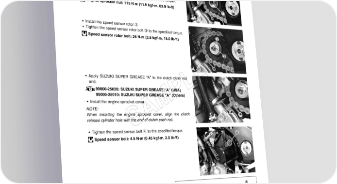 ENGINE 3-13 • Install the engine sprocket and the washer. • Apply a small quantity of THREAD LOCK to the driveshaft thread portion. 99000-32050: THREAD LOCK “1342” • Tighten the engine sprocket nut 1 to the specified torque. Engine sprocket nut: 115 N·m (11.5 kgf-m, 83.0 lb-ft) • Install the speed sensor rotor 2. • Tighten the speed sensor rotor bolt 3 to the specified torque. Speed sensor rotor bolt: 25 N·m (2.5 kgf-m, 18.0 lb-ft) • Apply SUZUKI SUPER GREASE “A” to the clutch push rod E end. L 99000-25030: SUZUKI SUPER GREASE “A” (USA) 99000-25010: SUZUKI SUPER GREASE “A” (Others) P • Install the engine sprocket cover. M NOTE: When installing the engine sprocket cover, align the clutch A release cylinder hole with the end of clutch push rod. S • Tighten the speed sensor bolt 4 to the specified torque. Speed sensor bolt: 4.5 N·m (0.45 kgf-m, 3.0 lb-ft) • Install the gearshift lever as shown. A Footrest B 50 – 60 mm (1.97 – 2.36 in)