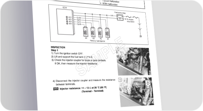 FI SYSTEM DIAGNOSIS 4-75 “C32” (P0201), “C33” (P0202), “C34” (P0203) or “C35” (P0204) PRIMARY FUEL INJECTOR CIRCUIT MALFUNCTION DETECTED CONDITION POSSIBLE CAUSE CKP signal is produced but fuel injector signal is • Injector circuit open or short interrupted by 4 times or more continuously. • Injector malfunction • ECM malfunction ECM Fuel pump relay Y/R To engine #11 Gr/W stop switch #21 Gr/B #31 Gr/Y #41 Gr/R #4 #3 #2 #1 Primary fuel injector INSPECTION 1 E Step 1 L 1) Turn the ignition switch OFF. 2) Lift and support the fuel tank (5-3) P 3) Check the injector coupler for loose or poor contacts. If OK, then measure the injector resistance. SAM 4) Disconnect the injector coupler and measure the resistance 1 between terminals. Injector resistance: 11 – 13 Ω at 20 °C (68 °F) (Terminal – Terminal)
