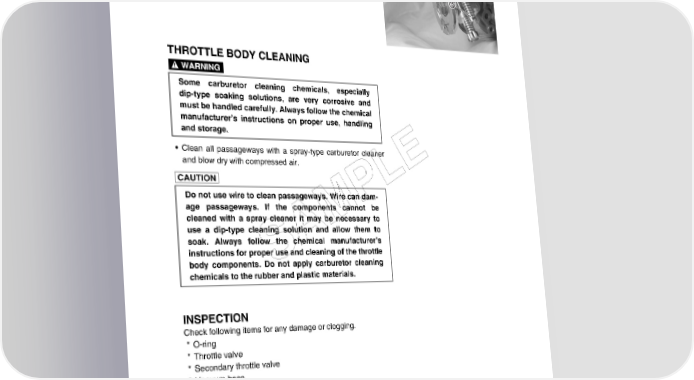 FUEL SYSTEM AND THROTTLE BODY 5-17 The fast idle screw E is factory-adjusted at the time of delivery and therefore avoid removing or turning it unless otherwise necessary. THROTTLE BODY CLEANING Some carburetor cleaning chemicals, especially dip-type soaking solutions, are very corrosive and must be handled carefully. Always follow the chemical manufacturer’s instructions on proper use, handling and storage. • Clean all passageways with a spray-type carburetor cleaner and blow dry with compressed air. E L Do not use wire to clean passageways. Wire can dam- P age passageways. If the components cannot be cleaned with a spray cleaner it may be necessary to M use a dip-type cleaning solution and allow them to soak. Always follow the chemical manufacturer’s A instructions for proper use and cleaning of the throttle S body components. Do not apply carburetor cleaning chemicals to the rubber and plastic materials. INSPECTION Check following items for any damage or clogging. *O-ring * Throttle valve * Secondary throttle valve * Vacuum hose