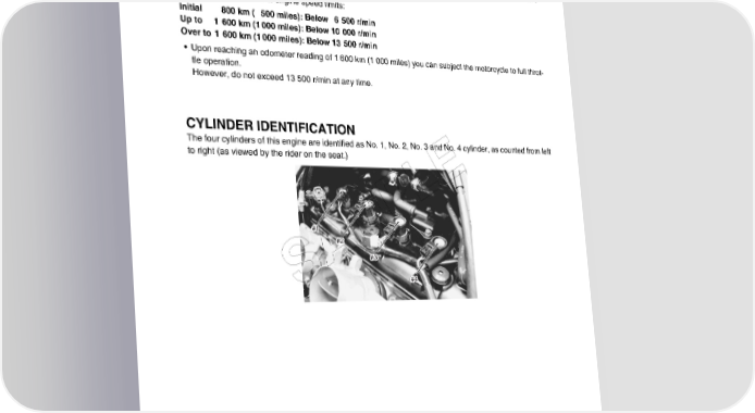 GENERAL INFORMATION 1-7 BREAK-IN PROCEDURES During manufacture only the best possible materials are used and all machined parts are finished to a very high standard but it is still necessary to allow the moving parts to “BREAK-IN” before subjecting the engine to maximum stresses. The future performance and reliability of the engine depends on the care and restraint exercised during its early life. The general rules are as follows. • Keep to these break-in engine speed limits: Initial 800 km ( 500 miles): Below 6 500 r/min Up to 1 600 km (1000 miles): Below 10 000 r/min Over to 1 600 km (1000 miles): Below 13 500 r/min • Upon reaching an odometer reading of 1 600 km (1 000 miles) you can subject the motorcycle to full throt- tle operation. However, do not exceed 13 500 r/min at any time. CYLINDER IDENTIFICATION The four cylinders of this engine are identified as No. 1, No. 2, No. 3 and No. 4 cylinder, as counted from left to right (as viewed by the rider on the seat.) E PL #1 #2 M A#3 S #4