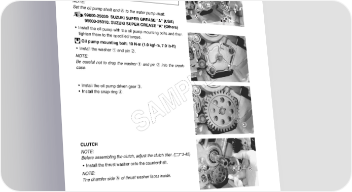 3-92 ENGINE OIL PUMP • Install the O-ring to the oil pump and apply SUZUKI SUPER GREASE “A” to it. Use a new O-ring to prevent oil leakage. NOTE: Set the oil pump shaft end A to the water pump shaft. 99000-25030: SUZUKI SUPER GREASE “A” (USA) 99000-25010: SUZUKI SUPER GREASE “A” (Others) • Install the oil pump with the oil pump mounting bolts and then tighten them to the specified torque. Oil pump mounting bolt: 10 N·m (1.0 kgf-m, 7.0 lb-ft) • Install the washer 1 and pin 2. NOTE: Be careful not to drop the washer 1 and pin 2 into the crank- case. E • Install the oil pump driven gear 3. L • Install the snap ring 4. P M A S CLUTCH NOTE: Before assembling the clutch, adjust the clutch lifter. (3-45) • Install the thrust washer onto the countershaft. NOTE: The chamfer side A of thrust washer faces inside.