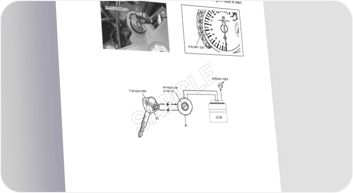 ELECTRICAL SYSTEM 9-21 IMMOBILIZER (Except for E-03, 28, 33) DESCRIPTION The immobilizer, an anti-theft system, is installed as a standard equipment. The immobilizer verifies that the key ID agrees with ECM ID by means of radio communication through the immobilizer antenna. When the ID agreement is verified, the system makes the engine ready to start. Immobi-antenna Indicator light Indicator light Immobilizer E Transponder antenna PL M ID ECM SA