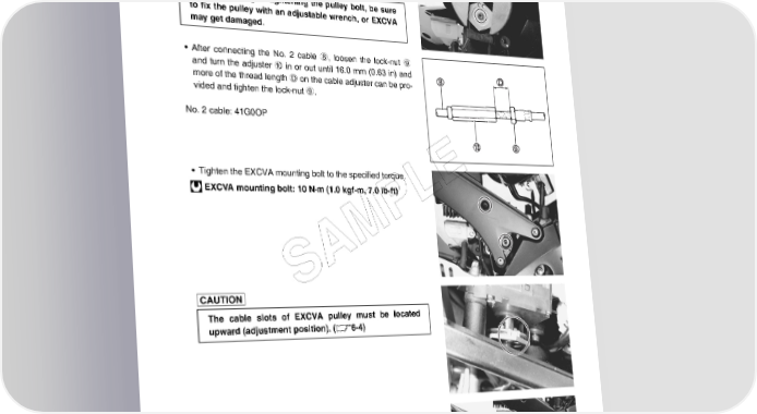EXHAUST SYSTEM 6-7 • Hold the pulley with an adjustable wrench, and then tighten the pulley mounting bolt to the specified torque. EXCVA pulley mounting bolt: 5 N·m (0.5 kgf-m, 3.5 lb-ft) When loosening or tightening the pulley bolt, be sure to fix the pulley with an adjustable wrench, or EXCVA may get damaged. • After connecting the No. 2 cable 8, loosen the lock-nut 9 and turn the adjuster 0 in or out until 16.0 mm (0.63 in) and more of the thread length D on the cable adjuster can be pro- vided and tighten the lock-nut 9. No. 2 cable: 41G0OP • Tighten the EXCVA mounting bolt to the specified torque. E EXCVA mounting bolt: 10 N·m (1.0 kgf-m, 7.0 lb-ft) L P M A S The cable slots of EXCVA pulley must be located upward (adjustment position). (6-4) • Install the front footrest assembly. Front footrest bracket mounting bolt: 23 N·m (2.3 kgf-m, 16.5 lb-ft)