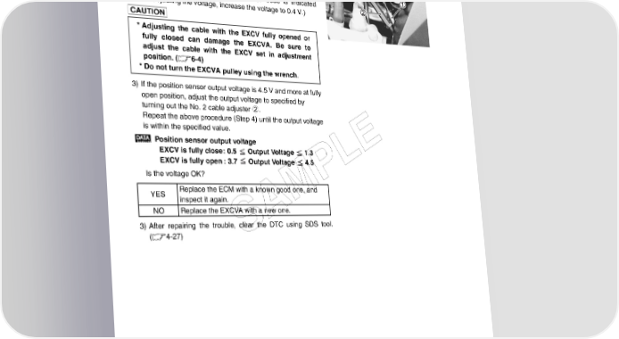 4-88 FI SYSTEM DIAGNOSIS Step 5 5 1) If the position sensor output voltage is 0.5 V and less at fully close position, adjust the output voltage to specified by turn- ing out the No. 1 cable adjuster 1. 2) Repeat the above procedure (Step 4) until the out put voltage becomes specified value. (If C46/P1657 code is indicated after adjusting the voltage, increase the voltage to 0.4 V.) * Adjusting the cable with the EXCV fully opened or fully closed can damage the EXCVA. Be sure to adjust the cable with the EXCV set in adjustment position. (6-4) * Do not turn the EXCVA pulley using the wrench. 3) If the position sensor output voltage is 4.5 V and more at fully open position, adjust the output voltage to specified by turning out the No. 2 cable adjuster 2. Repeat the above procedure (Step 4) until the output voltage is within the specified value. Position sensor output voltage E EXCV is fully close: 0.5 Output Voltage 1.3 EXCV is fully open: 3.7 Output Voltage 4.5 L Is the voltage OK? P YES Replace the ECM with a known good one, and inspect it again. M NO Replace the EXCVA with a new one. A 3) After repairing the trouble, clear the DTC using SDS tool. (4-27) S