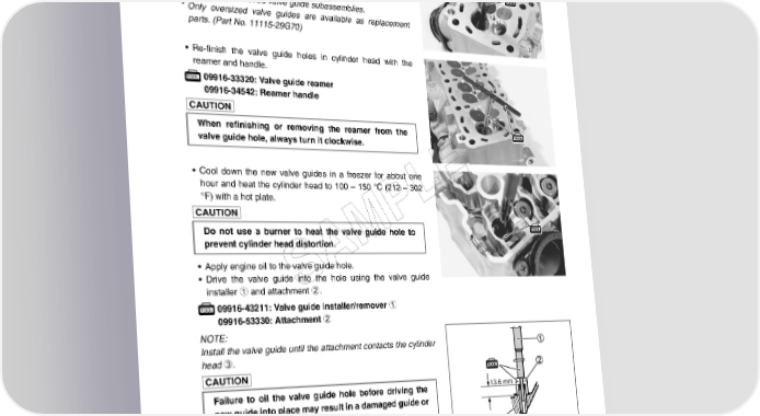 ENGINE 3-35 VALVE GUIDE SERVICING • Using the valve guide remover, drive the valve guide out toward the intake or exhaust camshaft side. 09916-53310: Valve guide remover/installer NOTE: * Discard the removed valve guide subassemblies. * Only oversized valve guides are available as replacement parts. (Part No. 11115-29G70) • Re-finish the valve guide holes in cylinder head with the reamer and handle. 09916-33320: Valve guide reamer 09916-34542: Reamer handle When refinishing or removing the reamer from the valve guide hole, always turn it clockwise. • Cool down the new valve guides in a freezer for about one E hour and heat the cylinder head to 100 – 150 °C (212 – 302 °F) with a hot plate. L P Do not use a burner to heat the valve guide hole to prevent cylinder head distortion. M • Apply engine oil to the valve guide hole. A • Drive the valve guide into the hole using the valve guide S installer 1 and attachment 2. 09916-43211: Valve guide installer/remover 1 09916-53330: Attachment 2 NOTE: Install the valve guide until the attachment contacts the cylinder head 3. Failure to oil the valve guide hole before driving the 13.6 mm new guide into place may result in a damaged guide or head.