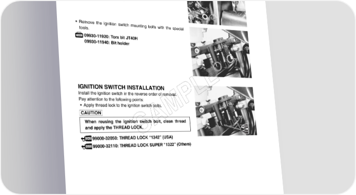 9-38 ELECTRICAL SYSTEM IGNITION SWITCH REMOVAL • Remove the air cleaner box. (5-13) • Disconnect the ignition switch lead wire coupler (Green) 1. • Disconnect the immobilizer lead wire coupler (Black) 2. (For E-02, 19, 24) • Remove the cable guide 3. • Remove the ignition switch mounting bolts with the special tools. 09930-11920: Torx bit JT40H 09930-11940: Bit holder IGNITION SWITCH INSTALLATION E Install the ignition switch in the reverse order of removal. L Pay attention to the following points: P • Apply thread lock to the ignition switch bolts. M When reusing the ignition switch bolt, clean thread and apply the THREAD LOCK. A S 99000-32050: THREAD LOCK “1342” (USA) 99000-32110: THREAD LOCK SUPER “1322” (Others)