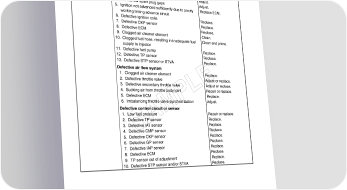 10-10 SERVICING INFORMATION Complaint Symptom and possible causes Remedy Engine runs poorly Defective engine internal/electrical parts in high speed range. 1. Weakened valve springs Replace. 2. Worn camshafts Replace. 3. Valve timing out of adjustment Adjust. 4. Too narrow spark plug gaps Adjust. 5. Ignition not advanced sufficiently due to poorly Replace ECM. working timing advance circuit 6. Defective ignition coils Replace. 7. Defective CKP sensor Replace. 8. Defective ECM Replace. 9. Clogged air cleaner element Clean. 10. Clogged fuel hose, resulting in inadequate fuel Clean and prime. supply to injector 11. Defective fuel pump Replace. 12. Defective TP sensor Replace. 13. Defective STP sensor or STVA Replace. Defective air flow system 1. Clogged air cleaner element Replace. 2. Defective throttle valve Adjust or replace. E 3. Defective secondary throttle valve Adjust or replace. 4. Sucking air from throttle body joint LRepair or replace. 5. Defective ECM P Replace. 6. Imbalancing throttle valve synchronization Adjust. Defective control circuit or sensor 1. Low fuel pressure M Repair or replace. 2. Defective TP sensor Replace. A Replace. 3. Defective IAT sensor S Replace. 4. Defective CMP sensor 5. Defective CKP sensor Replace. 6. Defective GP sensor Replace. 7. Defective IAP sensor Replace. 8. Defective ECM Replace. 9. TP sensor out of adjustment Replace. 10. Defective STP sensor and/or STVA Replace.