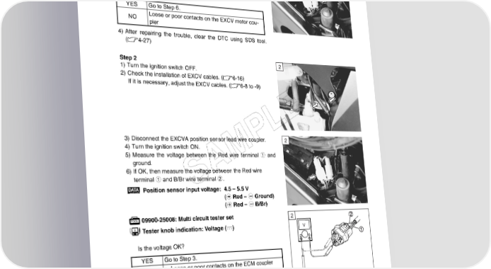 FI SYSTEM DIAGNOSIS 4-85 Step 1 (When indicating P1658:) 1 1) Turn the ignition switch OFF. 2) Lift and support the fuel tank. (5-3) 3) Check the EXCVA motor coupler for loose or poor contacts. Is the contacting OK? YES Go to Step 6. NO Loose or poor contacts on the EXCV motor cou- pler 4) After repairing the trouble, clear the DTC using SDS tool. (4-27) Step 2 2 1) Turn the ignition switch OFF. 2) Check the installation of EXCV cables. (6-16) If it is necessary, adjust the EXCV cables. (6-8 to -9) E L 3) Disconnect the EXCVA position sensor lead wire coupler. 2 4) Turn the ignition switch ON. P 5) Measure the voltage between the Red wire terminal 1 and ground. M 6) If OK, then measure the voltage between the Red wire A terminal 1 and B/Br wire terminal 2. S Position sensor input voltage: 4.5 – 5.5 V (+ Red – - Ground) (+ Red – - B/Br) 09900-25008: Multi circuit tester set 2 Tester knob indication: Voltage () V Is the voltage OK? YES Go to Step 3. • Loose or poor contacts on the ECM coupler NO (terminal A or S) • Open or short circuit in the Red wire or B/Br wire 7) After repairing the trouble, clear the DTC using SDS tool. (4-27)