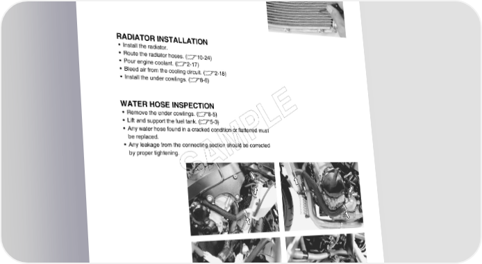 COOLING AND LUBRICATION SYSTEM 7-5 • Fins bent down or dented can be repaired by straightening them with the blade of a small screwdriver. RADIATOR INSTALLATION • Install the radiator. • Route the radiator hoses. (10-24) • Pour engine coolant. (2-17) • Bleed air from the cooling circuit. (2-18) • Install the under cowlings. (8-6) WATER HOSE INSPECTION • Remove the under cowlings. (8-5) E • Lift and support the fuel tank. (5-3) L • Any water hose found in a cracked condition or flattened must be replaced. P • Any leakage from the connecting section should be corrected by proper tightening. M A S