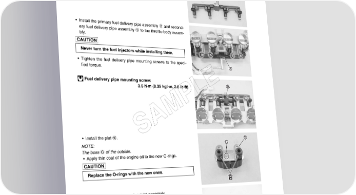 5-20 FUEL SYSTEM AND THROTTLE BODY • Assemble the fuel delivery pipes as shown. Never turn the fuel delivery pipes while pushing it. • Install the primary fuel delivery pipe assembly 8 and second- ary fuel delivery pipe assembly 9 to the throttle body assem- bly. Never turn the fuel injectors while installing them. • Tighten the fuel delivery pipe mounting screws to the speci- fied torque. Fuel delivery pipe mounting screw: E 3.5 N·m (0.35 kgf-m, 2.5 lb-ft) L P M A • Install the plat 0. S NOTE: The boss G of the outside. • Apply thin coat of the engine oil to the new O-rings. Replace the O-rings with the new ones. • Install the fuel delivery pipe joint assembly. • Tighten the fuel delivery pipe mounting screws to the speci- fied torque. Fuel delivery pipe mounting screw: 3.5 N·m (0.35 kgf-m, 2.5 lb-ft)