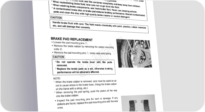 CHASSIS 8-63 * This brake system is filled with an ethylene glycol-based DOT 4 brake fluid. Do not use mix different types of fluid such as silicone-based or petroleum-based. * Do not use any brake fluid taken from old, used or unsealed containers. Never reuse brake fluid left over from the last servicing or stored for long periods. * When storing the brake fluid, seal the container completely and keep away from children. * When replenishing brake fluid, take care not to get dust into fluid. * When washing brake components, use fresh brake fluid. Never use cleaning solvent. * A contaminated brake disc or brake pad reduces braking performance. Discard contaminated pads and clean the disc with high quality brake cleaner or neutral detergent. Handle brake fluid with care: The fluid reacts chemically with paint, plastics, rubber materials etc. and will damage then severely. BRAKE PAD REPLACEMENT • Loosen the pad mounting pins 1. • Remove the brake caliper by removing the caliper mounting E bolts 2. • Remove the pad mounting pins 1, brake pads and spring. L P * Do not operate the brake lever with the pads removed. M * Replace the brake pads as a set, otherwise braking A performance will be adversely affected. NOTE: S * When the brake caliper is removed, care must be used so as not to cause stress to the brake hose. (Hang the brake caliper on the frame with a string, etc.) * When removing the pad spring, push the piston all the way into the brake caliper. • Inspect the pad mounting pins for bent or damage. If any defects are found, replace the pad mounting pins with the new ones.