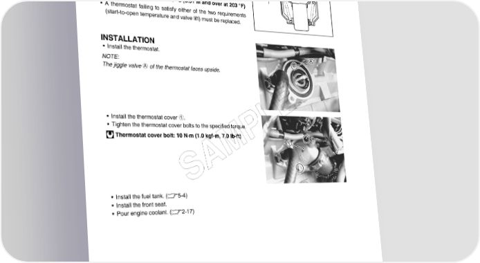 7-10 COOLING AND LUBRICATION SYSTEM • Keep on heating the water to raise its temperature. • Just when the water temperature reaches specified value, the thermostat valve should have lifted by at least 8 mm (0.31 in). Thermostat valve lift A Standard: 8.0 mm and over at 95 °C (0.31 in and over at 203 °F) • A thermostat failing to satisfy either of the two requirements (start-to-open temperature and valve lift) must be replaced. INSTALLATION • Install the thermostat. NOTE: The jiggle valve A of the thermostat faces upside. • Install the thermostat cover 1. E • Tighten the thermostat cover bolts to the specified torque. L Thermostat cover bolt: 10 N·m (1.0 kgf-m, 7.0 lb-ft) P M A S • Install the fuel tank. (5-4) • Install the front seat. • Pour engine coolant. (2-17)