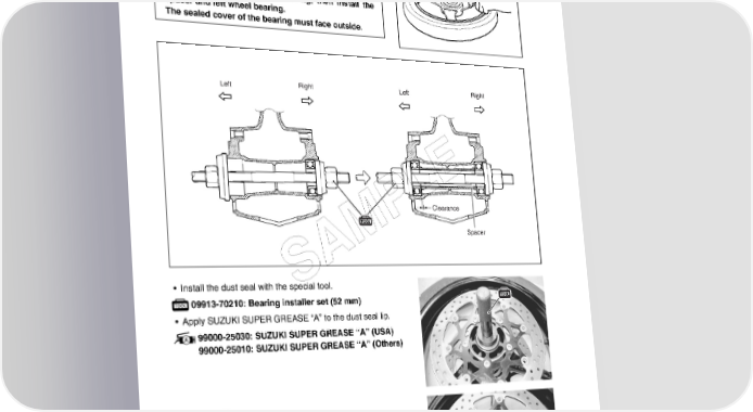 8-14 CHASSIS • Install the wheel bearings with the special tools as follows. 09941-34513: Bearing/Steering race installer set 09924-84510: Bearing installer set First install the right wheel bearing, then install the spacer and left wheel bearing. The sealed cover of the bearing must face outside. Left Right Left Right E L P Clearance AM Spacer S • Install the dust seal with the special tool. 09913-70210: Bearing installer set (52 mm) • Apply SUZUKI SUPER GREASE “A” to the dust seal lip. 99000-25030: SUZUKI SUPER GREASE “A” (USA) 99000-25010: SUZUKI SUPER GREASE “A” (Others) BRAKE DISC • Make sure that the brake disc is clean and free of any greasy matter. • Apply THREAD LOCK to the disc mounting bolts and tighten them to the specified torque. Brake disc bolt (Front): 23 N·m (2.3 kgf-m, 16.5 lb-ft) 99000-32130: THREAD LOCK SUPER “1360”