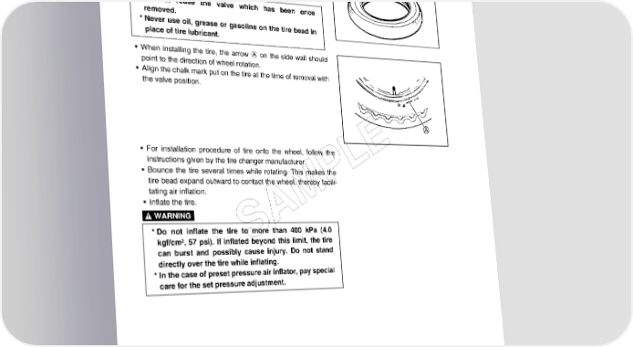 8-84 CHASSIS TIRE INSTALLATION • Apply tire lubricant to the tire bead. • When installing the tire onto the wheel, observe the following points. * Do not reuse the valve which has been once removed. * Never use oil, grease or gasoline on the tire bead in place of tire lubricant. • When installing the tire, the arrow A on the side wall should point to the direction of wheel rotation. • Align the chalk mark put on the tire at the time of removal with the valve position. • For installation procedure of tire onto the wheel, follow the E instructions given by the tire changer manufacturer. L • Bounce the tire several times while rotating. This makes the tire bead expand outward to contact the wheel, thereby facili- P tating air inflation. • Inflate the tire. M A * Do not inflate the tire to more than 400 kPa (4.0 S kgf/cm², 57 psi). If inflated beyond this limit, the tire can burst and possibly cause injury. Do not stand directly over the tire while inflating. * In the case of preset pressure air inflator, pay special care for the set pressure adjustment.