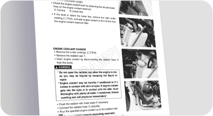 PERIODIC MAINTENANCE 2-17 COOLING SYSTEM Inspect every 6 000 km (4 000 miles, 12 months). Replace engine coolant every 2 years. ENGINE COOLANT LEVEL CHECK • Keep the motorcycle upright. • Check the engine coolant level by observing the full and lower lines on the engine coolant reservoir. A Full line B Lower line • If the level is below the lower line, remove the right under cowling (8-5), and add engine coolant to the full line from the engine coolant reservoir filler. ENGINE COOLANT CHANGE E • Remove the under cowlings. (8-5) L • Remove the radiator cap 1. • Drain engine coolant by disconnecting the radiator hose 2 from the pump. P M * Do not open the radiator cap when the engine is hot, A as you may be injured by escaping hot liquid or vapor. S * Engine coolant may be harmful if swallowed or if it comes in contact with skin or eyes. If engine coolant gets into the eyes or in contact with the skin, flush thoroughly with plenty of water. If swallowed, induce vomiting and call physician immediately! • Flush the radiator with fresh water if necessary. • Connect the radiator hose 2 securely. • Pour the specified engine coolant up to the radiator inlet. Engine coolant capacity (excluding reservoir): 2 150 ml (2.3/1.9 US/lmp qt) • Bleed the air from the engine coolant circuit in the following procedure. (2-18) ENGINE COOLANT INFORMATION (7-2)