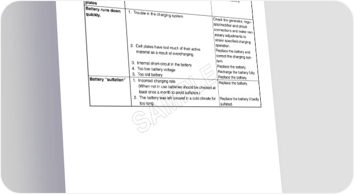 SERVICING INFORMATION 10-17 BATTERY Complaint Symptom and possible causes Remedy “Sulfation”, acidic 1. Cracked battery case Replace the battery. white powdery sub- 2. Battery has been left in a run-down condition for Replace the battery. stance or spots on a long time. surface of cell plates Battery runs down 1. Trouble in the charging system Check the generator, regu- quickly. lator/rectifier and circuit connections and make nec- essary adjustments to obtain specified charging operation. 2. Cell plates have lost much of their active Replace the battery and material as a result of overcharging. correct the charging sys- tem. 3. Internal short-circuit in the battery Replace the battery. 4. Too low battery voltage Recharge the battery fully. 5. Too old battery Replace the battery. Battery “sulfation” 1. Incorrect charging rate Replace the battery. E (When not in use batteries should be checked at least once a month to avoid sulfation.) L 2. The battery was left unused in a cold climate for Replace the battery if badly too long. P sulfated. M A S