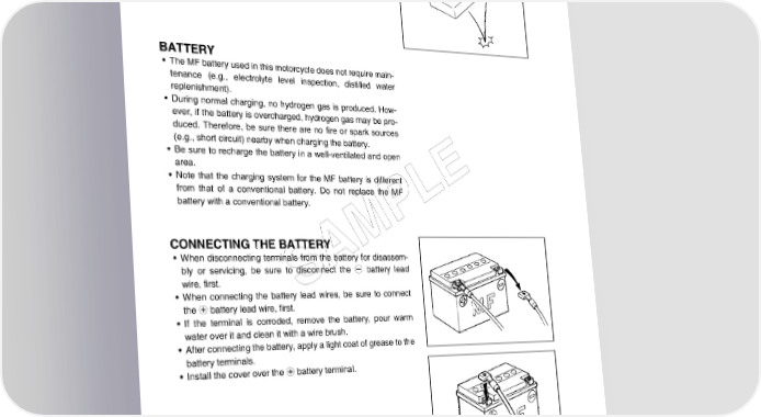 9-4 ELECTRICAL SYSTEM SEMI-CONDUCTOR EQUIPPED PART • Be careful not to drop the part with a semi-conductor built in INCORRECT such as a ECM. • When inspecting this part, follow inspection instruction strictly. Neglecting proper procedure may cause damage to this part. BATTERY • The MF battery used in this motorcycle does not require main- tenance (e.g., electrolyte level inspection, distilled water replenishment). • During normal charging, no hydrogen gas is produced. How- ever, if the battery is overcharged, hydrogen gas may be pro- duced. Therefore, be sure there are no fire or spark sources (e.g., short circuit) nearby when charging the battery. • Be sure to recharge the battery in a well-ventilated and open area. • Note that the charging system for the MF battery is different E from that of a conventional battery. Do not replace the MF L battery with a conventional battery. P CONNECTING THE BATTERY M • When disconnecting terminals from the battery for disassem- A bly or servicing, be sure to disconnect the - battery lead wire, first. S • When connecting the battery lead wires, be sure to connect the + battery lead wire, first. • If the terminal is corroded, remove the battery, pour warm water over it and clean it with a wire brush. • After connecting the battery, apply a light coat of grease to the battery terminals. • Install the cover over the + battery terminal. WIRING PROCEDURE • Properly route the wire harness according to the “WIRING HARENESS ROUTING” section. (10-18 to -20)