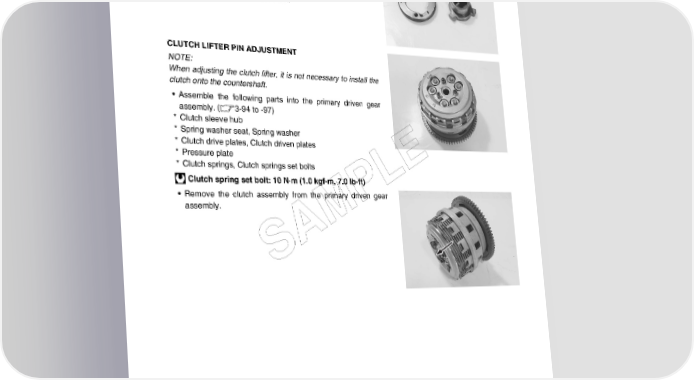 ENGINE 3-45 CLUTCH LIFTER CLUTCH LIFTER DRIVE CAM AND DRIVEN CAM INSPEC- TION • Inspect the clutch lifter drive cam and driven cam for wear or damage. If any defects are found, replace the clutch lifter drive cam and driven cam as a set. CLUTCH LIFTER PIN ADJUSTMENT NOTE: When adjusting the clutch lifter, it is not necessary to install the clutch onto the countershaft. • Assemble the following parts into the primary driven gear assembly. (3-94 to -97) * Clutch sleeve hub * Spring washer seat, Spring washer * Clutch drive plates, Clutch driven plates * Pressure plate E * Clutch springs, Clutch springs set bolts Clutch spring set bolt: 10 N·m (1.0 kgf-m, 7.0 lb-ft) L • Remove the clutch assembly from the primary driven gear assembly. P M A S