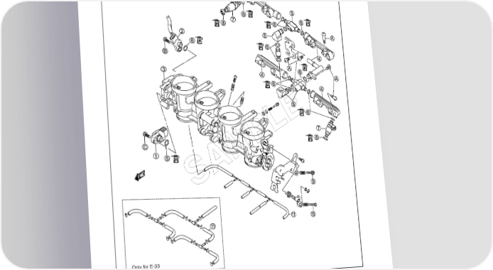 5-12 FUEL SYSTEM AND THROTTLE BODY THROTTLE BODY CONSTRUCTION E L P M A S Only for E-33 1 TP sensor 8 Cushion seal 2 STP sensor 9 Fast idle adjusting screw 3 STVA 0 Throttle stop screw 4 Fuel delivery pipe A Vacuum hose ITEM N·m kgf-m lb-ft 5 Fuel delivery pipe joint A Fuel delivery pipe mounting screw A 3.5 0.35 2.5 6 O-ring B STP sensor mounting screw B 3.5 0.35 2.5 7 Fuel injector C TP sensor mounting screw C 3.5 0.35 2.5