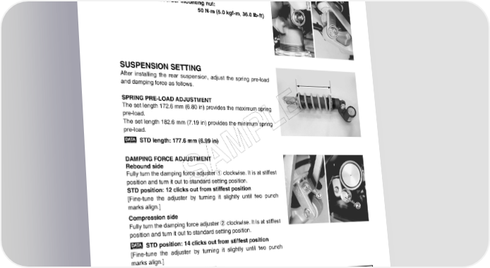 CHASSIS 8-51 INSTALLATION Remount the rear shock absorber in the reverse order of removal. Pay attention to the following points: • Install the rear shock absorber and tighten the rear shock absorber upper/lower mounting bolts and nuts. Rear shock absorber mounting nut: 50 N·m (5.0 kgf-m, 36.0 lb-ft) SUSPENSION SETTING After installing the rear suspension, adjust the spring pre-load and damping force as follows. SPRING PRE-LOAD ADJUSTMENT The set length 172.6 mm (6.80 in) provides the maximum spring pre-load. E The set length 182.6 mm (7.19 in) provides the minimum spring pre-load. L STD length: 177.6 mm (6.99 in) P DAMPING FORCE ADJUSTMENT M Rebound side A Fully turn the damping force adjuster 1 clockwise. It is at stiffest position and turn it out to standard setting position. S STD position: 12 clicks out from stiffest position [Fine-tune the adjuster by turning it slightly until two punch marks align.] Compression side Fully turn the damping force adjuster 2 clockwise. It is at stiffest position and turn it out to standard setting position. STD position: 14 clicks out from stiffest position [Fine-tune the adjuster by turning it slightly until two punch marks align.] Standard suspension setting REAR Spring set length Damping force adjuster Rebound Compression Solo and 177.6 mm (6.99 in) 12 clicks out from stiffest position 14 clicks out from stiffest position dual riding