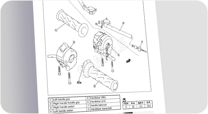 8-36 CHASSIS HANDLEBARS CONSTRUCTION E L P WD M FFWD A S 1 Left handle grip 5 Handlebar (RH) 2 Right handle throttle grip 6 Handlebar (LH) 3 Right handle switch 7 Handle balancer ITEM N·m kgf-m lb-ft 4 Left handle switch A Handlebar clamp bolt A 23 2.3 16.5 REMOVAL • Remove the brake master cylinder 1. • Remove the right handle switch 2. • Remove the handle balancer 3. • Remove the right handle throttle grip 4.