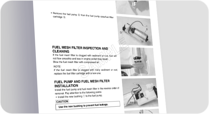 FUEL SYSTEM AND THROTTLE BODY 5-9 • Remove the fuel mesh filter 7. • Remove the fuel pump 8 from the fuel pump case/fuel filter cartridge 9. FUEL MESH FILTER INSPECTION AND E CLEANING L If the fuel mesh filter is clogged with sediment or rust, fuel will not flow smoothly and loss in engine power may result.P Blow the fuel mesh filter with compressed air. NOTE: M If the fuel mesh filter is clogged with many sediment or rust, A replace the fuel filter cartridge with a new one. S FUEL PUMP AND FUEL MESH FILTER INSTALLATION Install the fuel pump and fuel mesh filter in the reverse order of removal. Pay attention to the following points: • Install the new bushing 1 to the fuel pump. Use the new bushing to prevent fuel leakage. • Install the new O-ring to the fuel pipe. • Apply thin coat of the engine oil to new O-ring. Use the new O-ring to prevent fuel leakage.