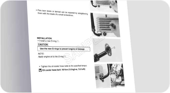 7-18 COOLING AND LUBRICATION SYSTEM INSPECTION AND CLEANING • Road dirt or trash stuck to the fins must be removed. • Use of compressed air is recommended for this cleaning. • Fins bent down or dented can be repaired by straightening them with the blade of a small screwdriver. INSTALLATION E • Install a new O-ring 1. L Use the new O-rings to prevent engine oil leakage. P NOTE: M Apply engine oil to the O-ring 1. A S • Tighten the oil cooler hose bolts to the specified torque. Oil cooler hose bolt: 10 N·m (1.0 kgf-m, 7.0 lb-ft)
