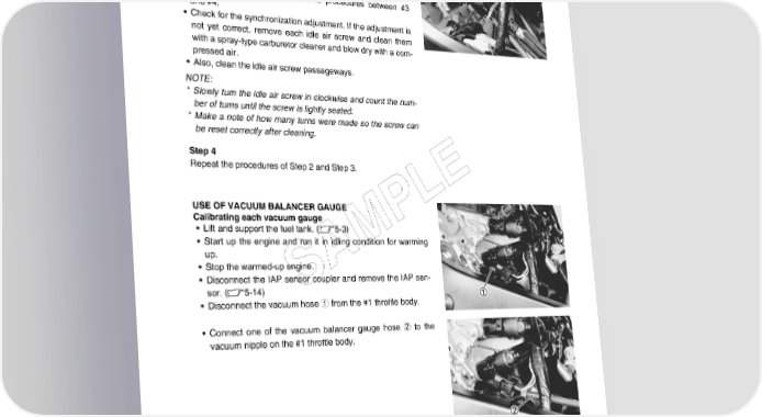 FUEL SYSTEM AND THROTTLE BODY 5-27 Step 3 • Turn in all the idle air screws to the complete close position. • Check for difference of vacuum between #1 and #2. • Equalize these two by gradually turning back the air screw on the higher vacuum side until the vacuum comes down to the lower. Similarly perform the same procedures between #3 and #4. • Check for the synchronization adjustment. If the adjustment is not yet correct, remove each idle air screw and clean them with a spray-type carburetor cleaner and blow dry with a com- pressed air. • Also, clean the idle air screw passageways. NOTE: * Slowly turn the idle air screw in clockwise and count the num- ber of turns until the screw is lightly seated. * Make a note of how many turns were made so the screw can be reset correctly after cleaning. Step 4 Repeat the procedures of Step 2 and Step 3. E USE OF VACUUM BALANCER GAUGE L Calibrating each vacuum gauge P • Lift and support the fuel tank. (5-3) • Start up the engine and run it in idling condition for warming up. M • Stop the warmed-up engine. A • Disconnect the IAP sensor coupler and remove the IAP sen- sor. (5-14) S • Disconnect the vacuum hose 1 from the #1 throttle body. • Connect one of the vacuum balancer gauge hose 2 to the vacuum nipple on the #1 throttle body.