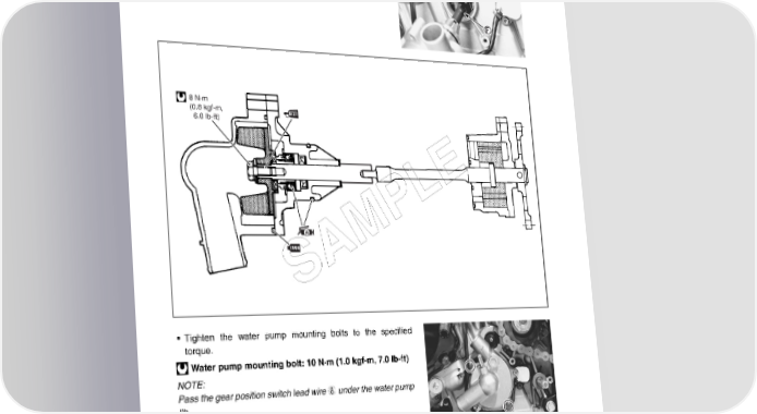 7-16 COOLING AND LUBRICATION SYSTEM • Install the water pump. NOTE: Set the water pump shaft end F to the oil pump shaft G as shown. 8 N·m (0.8 kgf-m, 6.0 lb-ft) E PL SAM • Tighten the water pump mounting bolts to the specified torque. Water pump mounting bolt: 10 N·m (1.0 kgf-m, 7.0 lb-ft) NOTE: Pass the gear position switch lead wire 8 under the water pump lib. • Connect the water hoses. (10-24) • Install the engine sprocket cover. • Install the gearshift lever. • Pour engine coolant. (2-17) • Pour engine oil. (2-12) • Install the under cowlings. (8-6)