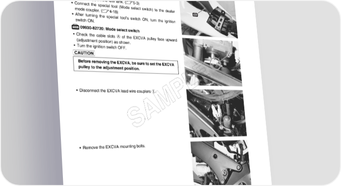 6-4 EXHAUST SYSTEM EXCVA (EXHAUST CONTROL VALVE ACTUATOR) AND EXCV (EXHAUST CONTROL VALVE) EXCVA REMOVAL • Turn the ignition switch OFF. • Remove the front seat. • Lift and support the fuel tank. (5-3) • Connect the special tool (Mode select switch) to the dealer mode coupler. (4-18) • After turning the special tool’s switch ON, turn the ignition switch ON. 09930-82720: Mode select switch • Check the cable slots A of the EXCVA pulley face upward (adjustment position) as shown. • Turn the ignition switch OFF. Before removing the EXCVA, be sure to set the EXCVA pulley to the adjustment position. E • Disconnect the EXCVA lead wire couplers 1. L P M A S • Remove the EXCVA mounting bolts.
