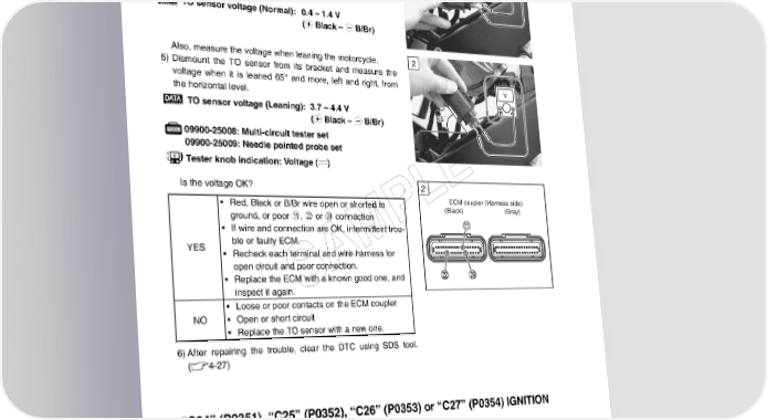 4-64 FI SYSTEM DIAGNOSIS Step 2 2 1) Connect the TO sensor coupler and ECM coupler. V 2) Insert the needle pointed probes to the lead wire coupler. 3) Turn the ignition switch ON. 4) Measure the voltage at the wire side coupler between Black and B/Br wires. TO sensor voltage (Normal): 0.4 – 1.4 V (+ Black – - B/Br) Also, measure the voltage when leaning the motorcycle. 2 5) Dismount the TO sensor from its bracket and measure the voltage when it is leaned 65° and more, left and right, from V the horizontal level. TO sensor voltage (Leaning): 3.7 – 4.4 V 65˚ (+ Black – - B/Br) 09900-25008: Multi-circuit tester set 09900-25009: Needle pointed probe set Tester knob indication: Voltage () E Is the voltage OK? 2 ECM coupler (Harness side) • Red, Black or B/Br wire open or shorted to L ground, or poor A, L or S connection P (Black) (Gray) • If wire and connection are OK, intermittent trou- YES ble or faulty ECM. M • Recheck each terminal and wire harness for open circuit and poor connection. A • Replace the ECM with a known good one, and inspect it again. S • Loose or poor contacts on the ECM coupler NO • Open or short circuit • Replace the TO sensor with a new one. 6)After repairing the trouble, clear the DTC using SDS tool. (4-27) “C24” (P0351), “C25” (P0352), “C26” (P0353) or “C27” (P0354) IGNITION SYSTEM MALFUNCTION * Refer to the IGNITION SYSTEM for details. (9-20)