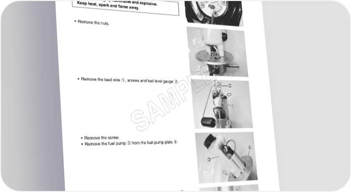 5-8 FUEL SYSTEM AND THROTTLE BODY REMOVAL • Remove the fuel tank. (5-3) • Remove the fuel pump assembly 1 by removing its mounting bolts diagonally. Gasoline is highly flammable and explosive. Keep heat, spark and flame away. • Remove the nuts. • Remove the lead wire 1, screws and fuel level gauge 2. E L P M A S • Remove the screw. • Remove the fuel pump 3 from the fuel pump plate 4. • Remove the fuel pump holder 5 and rubber cushion 6.