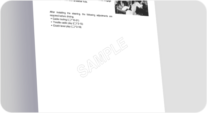CHASSIS 8-39 • Apply the SUZUKI SUPER GREASE “A” to the throttle cables and cable drum. 99000-25030: SUZUKI SUPER GREASE “A” (USA) 99000-25010: SUZUKI SUPER GREASE “A” (Others) • When remounting the right and left handle switches, engage the stopper with the handlebar hole. After installing the steering, the following adjustments are required before driving. • Cable routing (10-21) • Throttle cable play (2-15) • Clutch lever play (2-16) E L P M A S