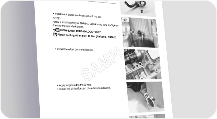 ENGINE 3-61 Installation • Fit the new O-ring 1 to each piston cooling oil jet as shown and apply engine oil to them. Use the new O-rings to prevent oil pressure leak. • Install each piston cooling oil jet with the bolt. NOTE: Apply a small quantity of THREAD LOCK to the bolts and tighten them to the specified torque. 99000-32050: THREAD LOCK “1342” Piston cooling oil jet bolt: 10 N·m (1.0 kgf-m, 7.0 lb-ft) • Install the oil jet (for transmission). E L P M A S • Apply engine oil to the O-ring. • Install the oil jet (for cam chain tension adjuster). PLUG Removal • Remove the oil gallery plugs 1 and 2. 1 (for cylinder head side) 2 (for upper crankcase side)