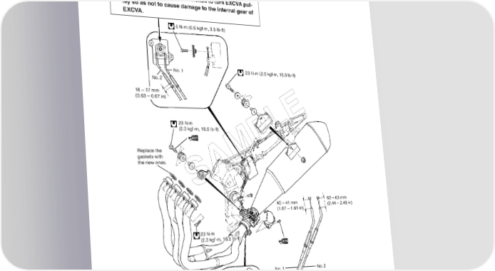 6-16 EXHAUST SYSTEM * When adjusting the No. 1 and No. 2 cables, the cable slots of EXCVA pulley must be located to adjustment position. * Do not use the adjustable wrench to turn EXCVA pul- ley so as not to cause damage to the internal gear of EXCVA. 5 N·m (0.5 kgf-m, 3.5 lb-ft) No. 1 23 N·m (2.3 kgf-m, 16.5 lb-ft) No. 2 16 – 17 mm (0.63 – 0.67 in) E 23 N·m (2.3 kgf-m, 16.5 lb-ft) PL Replace the gaskets with M the new ones. SA 40 – 41 mm 62 – 63 mm (1.57 – 1.61 in) (2.44 – 2.48 in) 23 N·m (2.3 kgf-m, 16.5 lb-ft) 23 N·m No. 1 No. 2 (2.3 kgf-m,16.5 lb-ft) 3 mm (0.12 in) Replace the exhaust pipe connector with 3 mm (0.12 in) a new one.