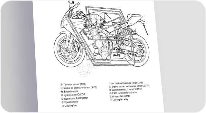 FI SYSTEM DIAGNOSIS 4-13 M C E E PL SAM I Tip-over sensor (TOS) J Atmospheric pressure sensor (APS) K Intake air pressure sensor (IAPS) L Engine coolant temperature sensor (ECTS) M Speed sensor N Camshaft position sensor (CMPS) O Ignition coil (IG COIL) P PAIR control solenoid valve Q Secondary fuel injector R Primary fuel injector S Speedometer T Cooling fan relay U Cooling fan