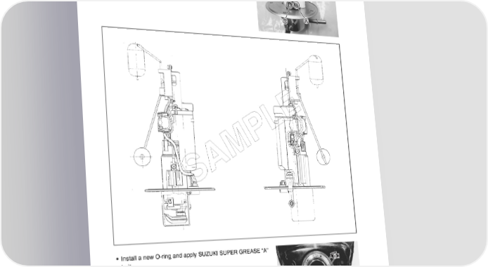 5-10 FUEL SYSTEM AND THROTTLE BODY • Be sure to connect the wires to the proper terminals. A............... + terminal for fuel pump B............... + terminal for fuel level gauge E L P M A S • Install a new O-ring and apply SUZUKI SUPER GREASE “A” to it. 99000-25030: SUZUKI SUPER GREASE “A” (USA) 99000-25010: SUZUKI SUPER GREASE “A” (Others) The O-ring must be replaced with a new one to prevent fuel leakage.