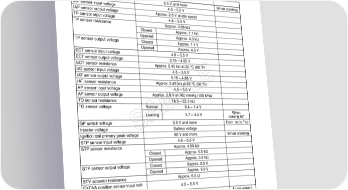 10-54 SERVICING INFORMATION FI SENSORS ITEM SPECIFICATION NOTE CMP sensor resistance 0.9 – 1.7 kΩ CMP sensor peak voltage 0.5 V and more When cranking CKP sensor resistance 142 – 194 Ω CKP sensor peak voltage 0.5 V and more When cranking IAP sensor input voltage 4.5 – 5.5 V IAP sensor output voltage Approx. 2.6 V at idle speed TP sensor input voltage 4.5 – 5.5 V TP sensor resistance Approx. 4.68 kΩ Closed Approx. 1.1 kΩ Opened Approx. 4.3 kΩ TP sensor output voltage Closed Approx. 1.1 V Opened Approx. 4.3 V ECT sensor input voltage 4.5 – 5.5 V ECT sensor output voltage 0.15 – 4.85 V ECT sensor resistance Approx. 2.45 kΩ at 20 °C (68 °F) IAT sensor input voltage 4.5 – 5.5 V IAT sensor output voltage 0.15 – 4.85 V IAT sensor resistance Approx. 2.45 kΩ at 20 °C (68 °F) E AP sensor input voltage 4.5 – 5.5 V L AP sensor output voltage Approx. 2.6 V at 760 mmHg (100 kPa) P TO sensor resistance 16.5 – 22.3 kΩ TO sensor voltage Normal M0.4 – 1.4 V Leaning 3.7 – 4.4 V When A leaning 65° GP switch voltage 0.6 V and more From 1st to Top Injector voltage S Battery voltage Ignition coil primary peak voltage 80 V and more When cranking STP sensor input voltage 4.5 – 5.5 V STP sensor resistance Approx. 4.69 kΩ Closed Approx. 0.5 kΩ Opened Approx. 3.9 kΩ STP sensor output voltage Closed Approx. 0.5 V Opened Approx. 3.9 V STV actuator resistance Approx. 6.5 Ω EXCVA position sensor input volt- 4.5 – 5.5 V age EXCVA position sensor resistance Approx. 3.1 kΩ At adjustment position EXCVA position sensor output volt- Closed 0.5 – 1.3 V age Opened 3.7 – 4.5 V PAIR control solenoid valve resis- 18 – 22 Ω at 20 – 30 °C (68 – 86 °F) tance