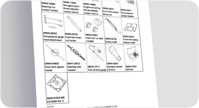 10-44 SERVICING INFORMATION 09940-14940 09940-14990 09940-14960 Swingarm pivot Engine mounting 09940-30221 09940-40211 Steering nut thrust adjuster thrust adjuster Front fork assem- Fuel pressure wrench socket socket wrench socket wrench bling tool gauge adaptor 09940-40220 09940-50120 09940-52861 09940-94922 Fuel pressure gauge Front fork inner Front fork oil seal 09940-92720 Front fork spring hose attachment rod holder installer Spring scale stopper plate E L P 09940-94930 09941-34513 M09944-28320 Front fork spacer Steering race 09943-74111 Hexagon socket 09904-41010 holder installer A SFork oil level gauge (19 mm) SDS Set 99565-01010-006 CD-ROM Ver. 6 NOTE: When order the special tool, please confirm whether it is available or not.