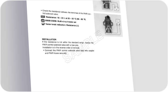 EMISSION CONTROL INFORMATION 11-7 • Connect the 12 V battery to the PAIR control solenoid valve terminals and check the air flow. • If air does not flow out, the solenoid valve is in normal condi- tion. 12V • Check the resistance between the terminals of the PAIR con- trol solenoid valve. Resistance: 18 – 22 Ω at 20 – 30 °C (68 – 86 °F) 09900-25008: Multi-circuit tester set Tester knob indication: Resistance (Ω) INSTALLATION E If the resistance is not within the standard range, replace the PAIR control solenoid valve with a new one. L Installation is in the reverse order of removal. P • Connect the PAIR control solenoid valve lead wire coupler and PAIR hoses securely. AM S