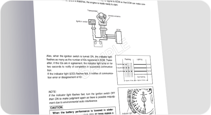 9-22 ELECTRICAL SYSTEM Operation When the ignition switch is turned ON with the engine stop switch in ON, the immobi-antenna and ECM are powered ON. The ECM transmits a signal to the transponder through the immobi-antenna in order to make comparison between the key ID and ECM ID. With the signal received, the transponder transmits the key ID signal to ECM so that ECM can make com- parison with its own ID, and if it matches, the engine is made ready to start. Transponder Immobi-antenna Ignition switch ECM E Also, when the ignition switch is turned ON, the indicator light L flashes as many as the number of IDs registered in ECM. There- Flashing Lighting P after, if the IDs are in agreement, the indicator light turns on for 2 registered Normal two seconds to notify of completion in successful communica- 3 registered Normal tion. M 4 registered Normal If the indicator light (LED) flashes fast, it notifies of communica- A Abnormal tion error or disagreement of ID. S Fast flashing Approx. 1.6 sec. Approx. 2.0 sec. NOTE: If the indicator light flashes fast, turn the ignition switch OFF then ON to make judgment again as there is possible misjudg- ment due to environmental radio interference. When the battery performance is lowered in winter (low temperature), the system may at times makes a Indicator light re-judgment at the time of beginning the starter motor operation. In this case, the indicator light operation starts immediately after the starter operation. NOTE: In the case that the LED flashes fast, remains lit or unlit, the probable cause of such a failure may be due to abnormal condition in the key, key cylinder, wiring harness or ECM. (If such a failure exists, contact your dis- tributor or dealer.)