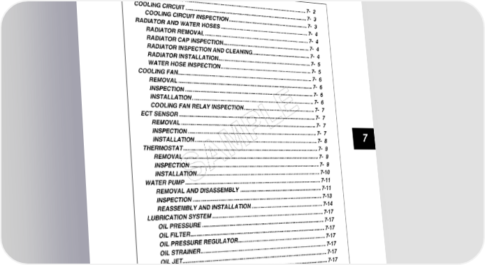 COOLING AND LUBRICATION SYSTEM 7-1 COOLING AND LUBRICATION SYSTEM CONTENTS ENGINE COOLANT...................................................................................... 7- 2 COOLING CIRCUIT...................................................................................... 7- 3 COOLING CIRCUIT INSPECTION......................................................... 7- 3 RADIATOR AND WATER HOSES............................................................... 7- 4 RADIATOR REMOVAL.......................................................................... 7- 4 RADIATOR CAP INSPECTION.............................................................. 7- 4 RADIATOR INSPECTION AND CLEANING.......................................... 7- 4 RADIATOR INSTALLATION.................................................................. 7- 5 WATER HOSE INSPECTION................................................................. 7- 5 COOLING FAN.............................................................................................. 7- 6 REMOVAL.............................................................................................. 7- 6 INSPECTION.......................................................................................... 7- 6 INSTALLATION...................................................................................... 7- 6 COOLING FAN RELAY INSPECTION................................................... 7- 7 ECT SENSOR............................................................................................... 7- 7 E REMOVAL.............................................................................................. 7- 7 L INSPECTION.......................................................................................... 7- 7 7 P INSTALLATION...................................................................................... 7- 8 THERMOSTAT.............................................................................................. 7- 9 M REMOVAL.............................................................................................. 7- 9 INSPECTION.......................................................................................... 7- 9 A INSTALLATION...................................................................................... 7-10 WATER PUMP.............................................................................................. 7-11 S REMOVAL AND DISASSEMBLY.......................................................... 7-11 INSPECTION.......................................................................................... 7-13 REASSEMBLY AND INSTALLATION................................................... 7-14 LUBRICATION SYSTEM.............................................................................. 7-17 OIL PRESSURE..................................................................................... 7-17 OIL FILTER............................................................................................. 7-17 OIL PRESSURE REGULATOR.............................................................. 7-17 OIL STRAINER....................................................................................... 7-17 OIL JET................................................................................................... 7-17 OIL PUMP............................................................................................... 7-17 OIL PRESSURE SWITCH...................................................................... 7-17 OIL COOLER.......................................................................................... 7-17 ENGINE LUBRICATION SYSTEM CHART........................................... 7-19 ENGINE LUBRICATION SYSTEM......................................................... 7-20