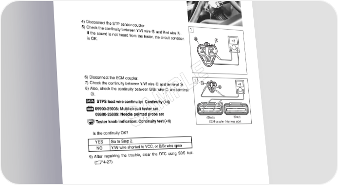 FI SYSTEM DIAGNOSIS 4-69 Step 1 (When indicating P1654-H:) 1 1) Turn the ignition switch OFF. 2) Lift and support the fuel tank. (5-3) 3) Check the STP sensor coupler for loose or poor contacts. If OK, then check the STP sensor lead wire continuity. 4) Disconnect the STP sensor coupler. 1 5) Check the continuity between Y/W wire B and Red wire A. ! If the sound is not heard from the tester, the circuit condition is OK. 6) Disconnect the ECM coupler. 1 E ! 7) Check the continuity between Y/W wire B and terminal J. L 8) Also, check the continuity between B/Br wire C and terminal S. P STPS lead wire continuity: Continuity () 09900-25008: Multi-circuit tester set M 09900-25009: Needle pointed probe set A (Black) (Gray) Tester knob indication: Continuity test () ECM coupler (Harness side) S Is the continuity OK? YES Go to Step 2. NO Y/W wire shorted to VCC, or B/Br wire open 9) After repairing the trouble, clear the DTC using SDS tool. (4-27)