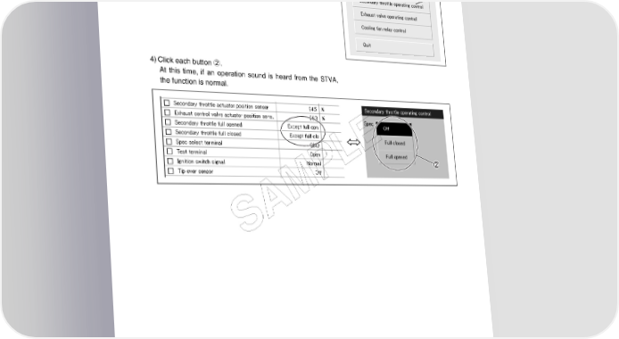 FI SYSTEM DIAGNOSIS 4-67 ACTIVE CONTROL INSPECTION 1)Set up the SDS tool. (Refer to the SDS operation manual for further details.) 2)Turn the ignition switch ON. 3)Click “Secondary throttle operating control” 1. 4)Click each button 2. At this time, if an operation sound is heard from the STVA, the function is normal. E L P M A S