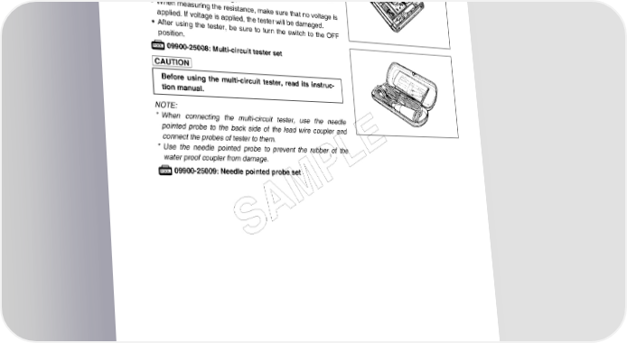 ELECTRICAL SYSTEM 9-5 USING THE MULTI-CIRCUIT TESTER • Properly use the multi-circuit tester + and - probes. Improper use can cause damage to the motorcycle and tester. • If the voltage and current values are not known, begin mea- suring in the highest range. • When measuring the resistance, make sure that no voltage is applied. If voltage is applied, the tester will be damaged. • After using the tester, be sure to turn the switch to the OFF position. 09900-25008: Multi-circuit tester set Before using the multi-circuit tester, read its instruc- tion manual. NOTE: * When connecting the multi-circuit tester, use the needle pointed probe to the back side of the lead wire coupler and connect the probes of tester to them. * Use the needle pointed probe to prevent the rubber of the E water proof coupler from damage. L 09900-25009: Needle pointed probe set P M A S