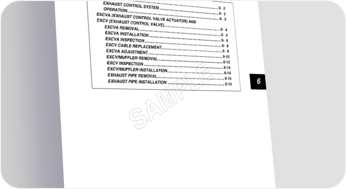 EXHAUST SYSTEM 6-1 EXHAUST SYSTEM CONTENTS EXHAUST SYSTEM...................................................................................... 6- 2 EXHAUST CONTROL SYSTEM............................................................ 6- 2 OPERATION........................................................................................... 6- 3 EXCVA (EXHAUST CONTROL VALVE ACTUATOR) AND EXCV (EXHAUST CONTROL VALVE)......................................................... 6- 4 EXCVA REMOVAL................................................................................. 6- 4 EXCVA INSTALLATION........................................................................ 6- 6 EXCVA INSPECTION............................................................................. 6- 8 4 EXCV CABLE REPLACEMENT............................................................. 6- 8 EXCVA ADJUSTMENT.......................................................................... 6-10 EXCV/MUFFLER REMOVAL................................................................. 6-13 EXCV INSPECTION............................................................................... 6-14 EXCV/MUFFLER INSTALLATION......................................................... 6-14 EXHAUST PIPE REMOVAL................................................................... 6-15 6 EXHAUST PIPE INSTALLATION.......................................................... 6-15 PLE SAM