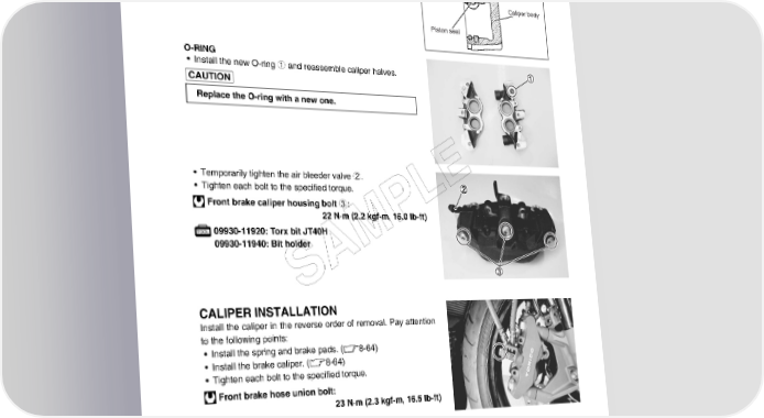 CHASSIS 8-67 PISTON SEAL • Install the piston seals as shown in the illustration. Dust seal Caliper body Piston seal O-RING • Install the new O-ring 1 and reassemble caliper halves. Replace the O-ring with a new one. • Temporarily tighten the air bleeder valve 2. E • Tighten each bolt to the specified torque. L Front brake caliper housing bolt 3: 22 N·m (2.2 kgf-m, 16.0 lb-ft) 09930-11920: Torx bit JT40H P 09930-11940: Bit holder M A S CALIPER INSTALLATION Install the caliper in the reverse order of removal. Pay attention to the following points: • Install the spring and brake pads. (8-64) • Install the brake caliper. (8-64) • Tighten each bolt to the specified torque. Front brake hose union bolt: 23 N·m (2.3 kgf-m, 16.5 lb-ft) * The seal washers should be replaced with the new ones to prevent fluid leakage. * Bleed air from the system after reassembling the cal- iper. (2-26)