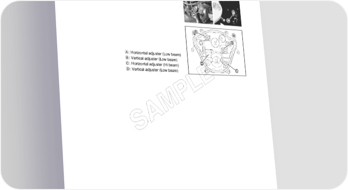 9-36 ELECTRICAL SYSTEM HEADLIGHT BEAM ADJUSTMENT • Adjust the headlight beam. NOTE: * Use a screw driver + for adjuster A, B and C. * To adjust the headlight beam, adjust the beam horizontally first, then adjust vertically. A: Horizontal adjuster (Low beam) B: Vertical adjuster (Low beam) C: Horizontal adjuster (Hi beam) D: Vertical adjuster (Low beam) E L P M A S